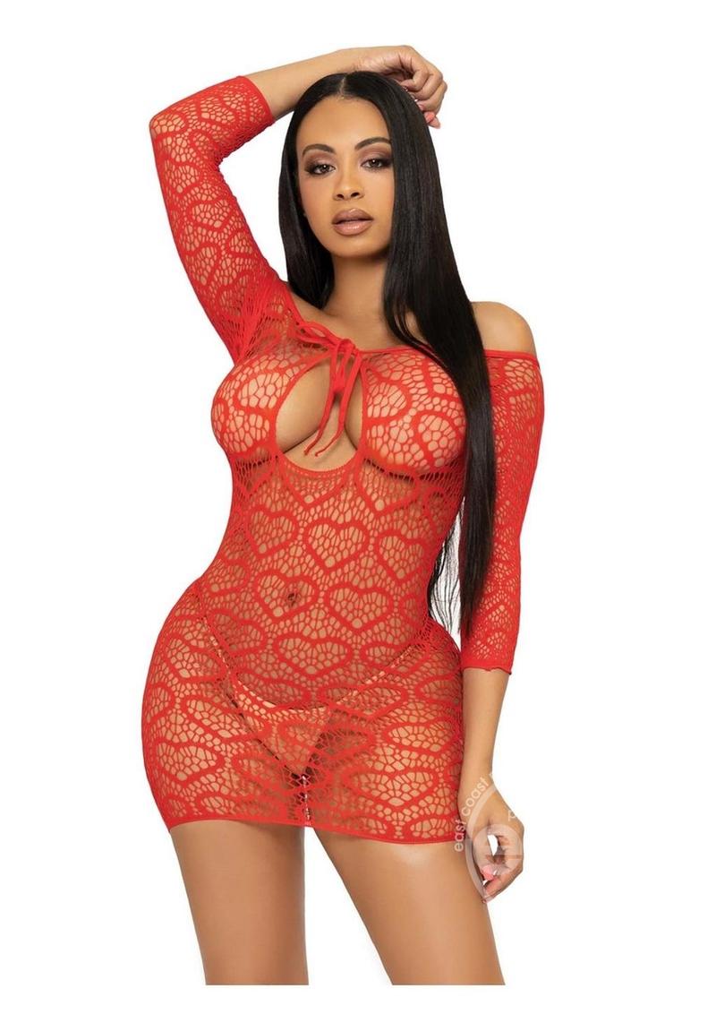 Leg Avenue Seamless Heart Net Mini Dress with Keyhole Tie Front - O/S - Red