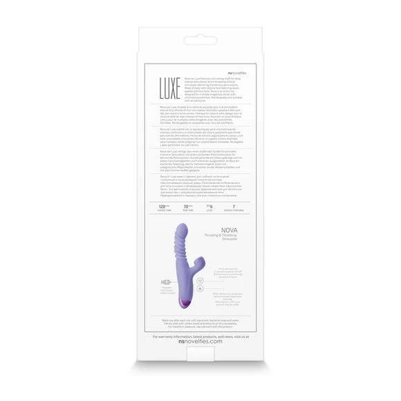 Nova by Luxe features a thrusting shaft for deep, intense stimulation and a throbbing clitoral stimulator delivering thunderous percussions. Made of body-safe silicone and featuring seven speeds and functions, Nova is an erotic toy designed for multiple erogenous zones with unlimited possibilities. Rechargeable and suitable with all lubricants.