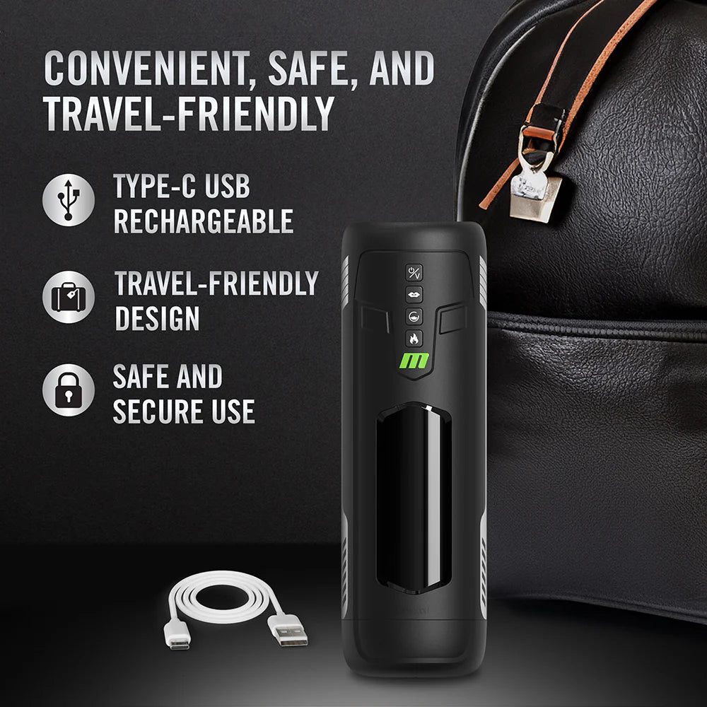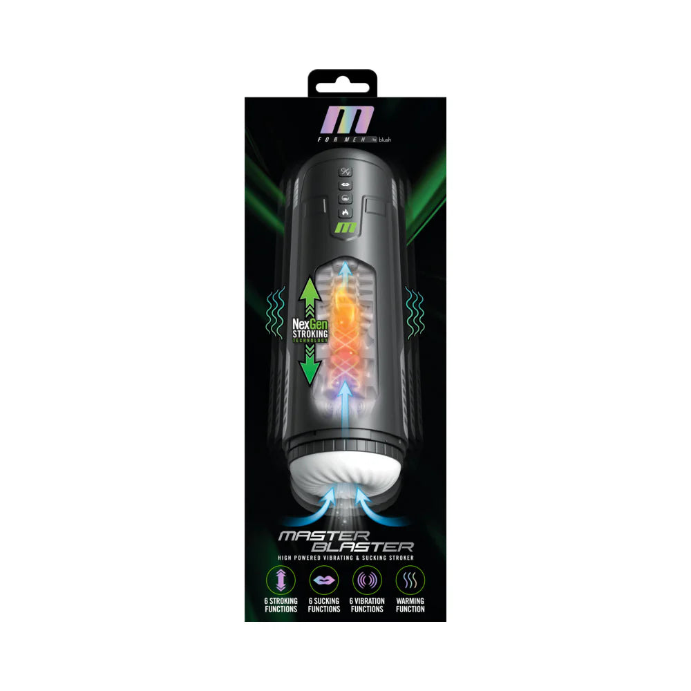 Your King of Strokers is here. The M For Men Master Blaster is in a class of its own. This futuristic, automatic male masturbator showcases a discreet and durable design, with a protective cover that keeps your masturbator protected and easy to maintain. It comes fully loaded with 4 innovative features, offering a highly customizable stroking experience that's ready to meet all your demands. Amp up the power with 6 dynamic vibrating, stroking, and sucking modes that engulf your shaft with waves of mind-blowing sensations. Cutting edge suction technology simulates a realistic oral experience, allowing you to feel every inch of the soft and textured inner chamber. The deluxe warming feature heats up your desires, offering extra stimulation for a uniquely immersive experience. With a USB-C charger included, enjoy up to 60 minutes of power on a full charge. Get ready to transcend to a new age of stroking pleasure with the Master Blaster. All hail to the king!