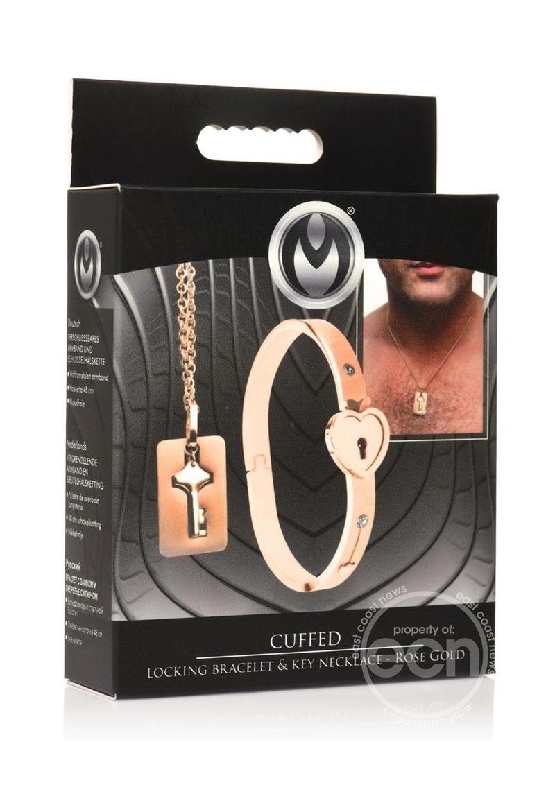 Give your pet the gift of luxury and discreetly show off your relationship to those in the know. With this heart-shaped, locking bracelet and dog-tag styled key you'll both be adorned with symbols of your D/s dynamic. The scratch resistant and nickel-free tungsten steel is durable and long-lasting. The rose-gold plating gives it a warm, luxurious tone that makes it an exquisite piece of jewelry for you both. The rhinestone adorned cuff has a lock built into the clasp, an accessory that can only be removed by the Keyholder. The key sits within the cut out of a tungsten steel tag, which hangs from a chain for you to wear upon your chest, reminding you of the pride and responsibility that comes with ownership. This beautiful set allows you to comfortably put your bond on display.