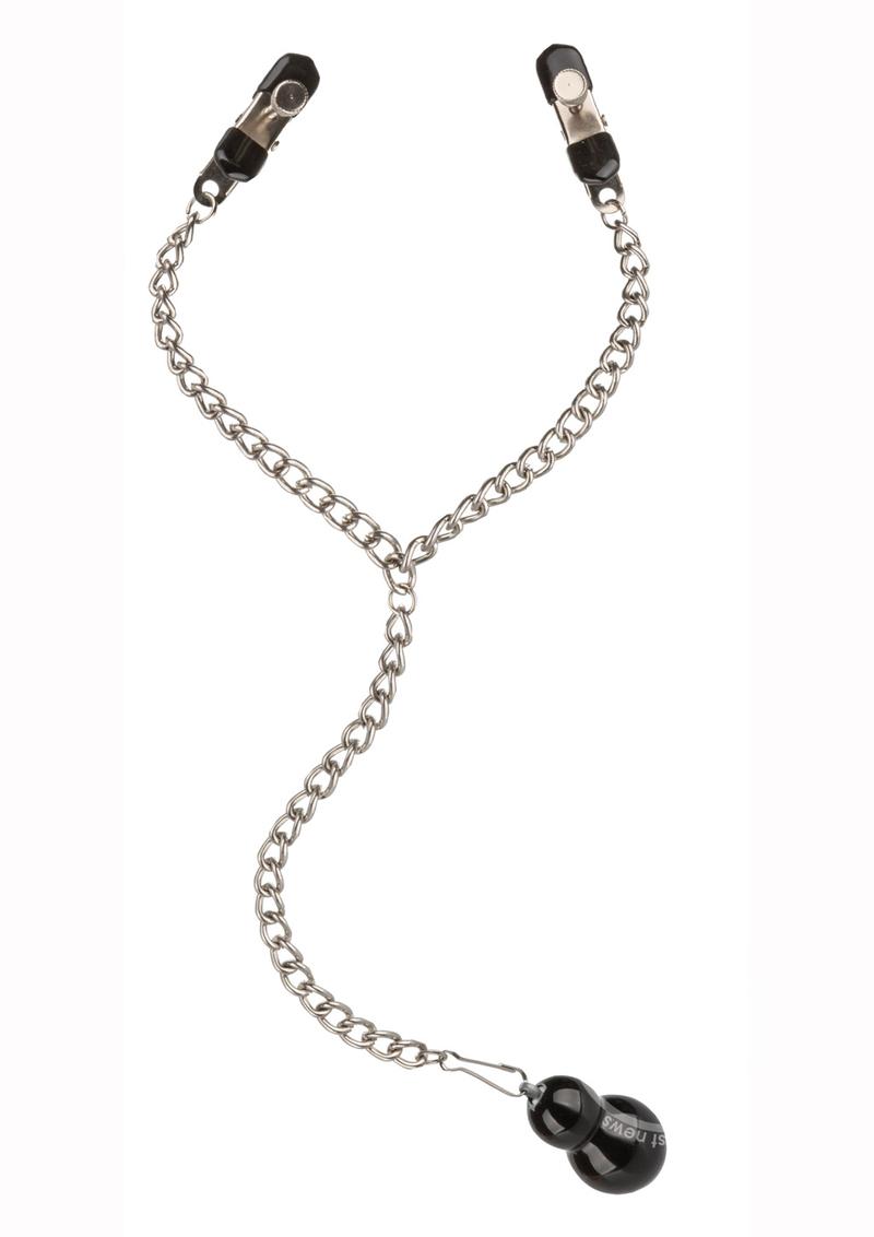 Blur the borders between pleasure and pain even further with the game-changing Nipple Play® Weighted Dual Tier Nipple Clamps. Explore elevated sensation with 2 adjustable nipple clamps, a thrilling chain and unique weight. Clamp the naughty clasps to your body and enjoy every rush of stimulation.