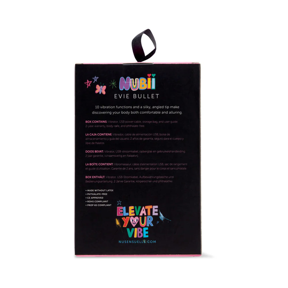 Always a trendsetter, Evie helped pave the way for affordable luxury. This lipstick-shaped bulletft.s 5 speeds and 5 modes empower our fashion-forward users to be fearless and embrace their sexuality in a fun, flirty way. The bulletft.s smooth, tapered design elevates the userft.s level of comfort while experimenting with external stimulation. Not to mention, Evie is USB-rechargeable, 100% body safe, water submersible, and powered by our buzzy Nubii motor. Like our other Nubii products, Evie allows new users to purchase toys of superior quality at a more attractive price.