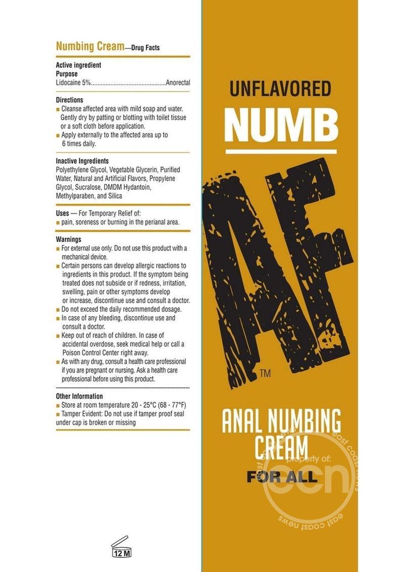 NUMB AF unflavored is specially formulated to make your anal experience more pleasurable. Numb AF anal desensitizing cream gently numbs on contact creating a comfortable sensation for anal play. For best results rub a generous amount around anal opening and wait 5 minutes for full activation before engaging in intercourse. Numb AF - Anal Desensitizing Gel is a pleasure positive product and was created with the intention of creating a more pleasurable and comfortable sexual experience for lovers.