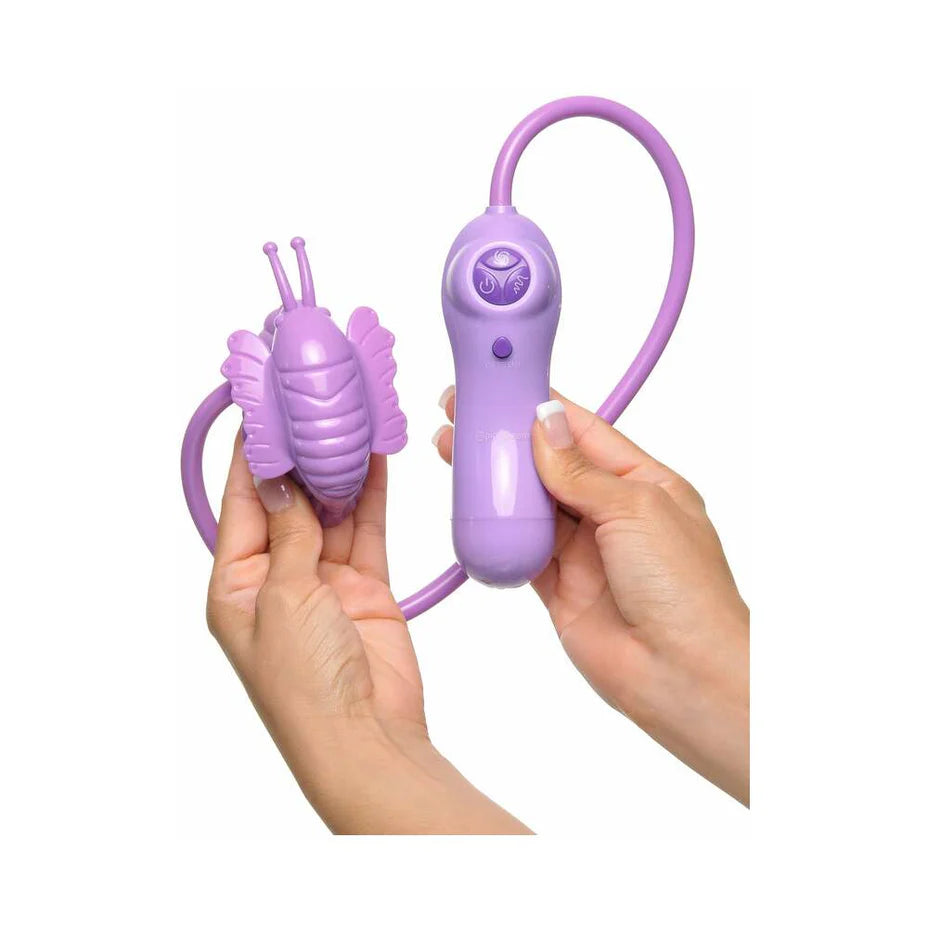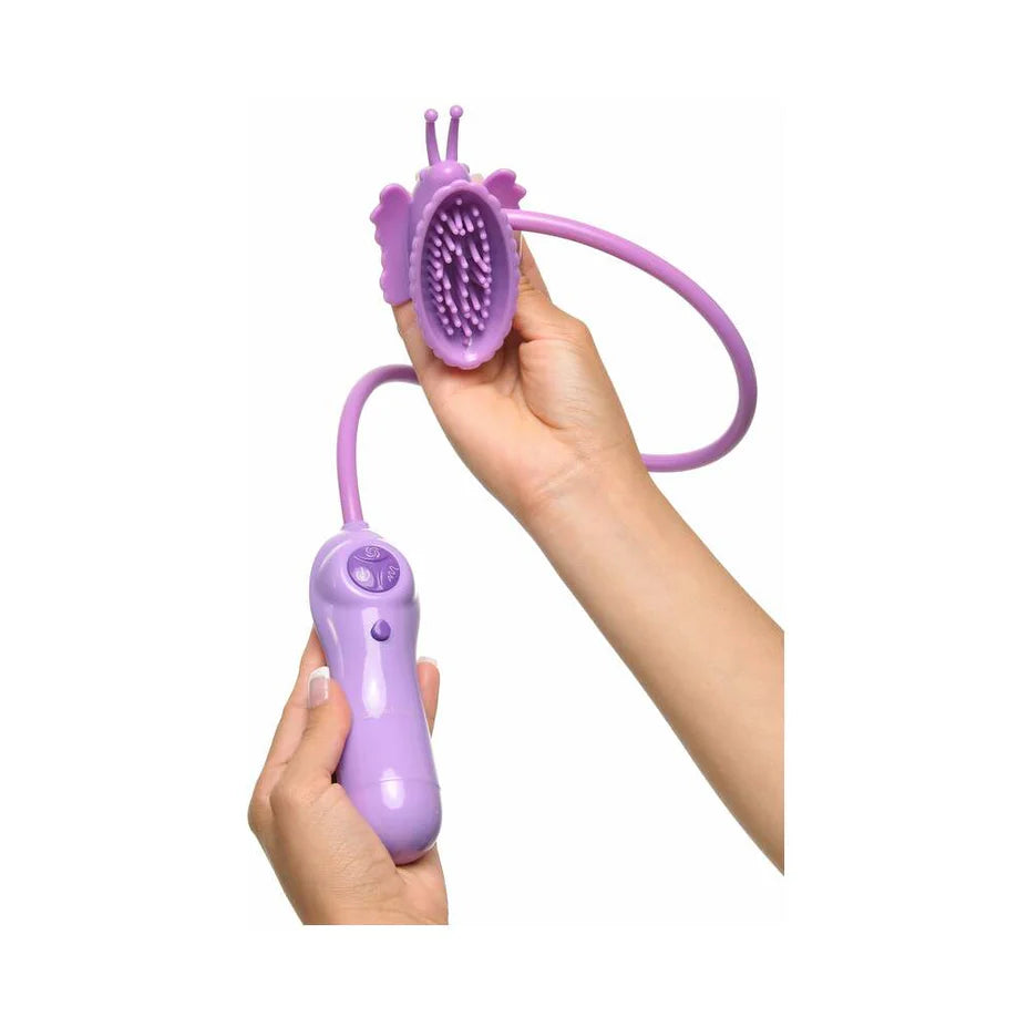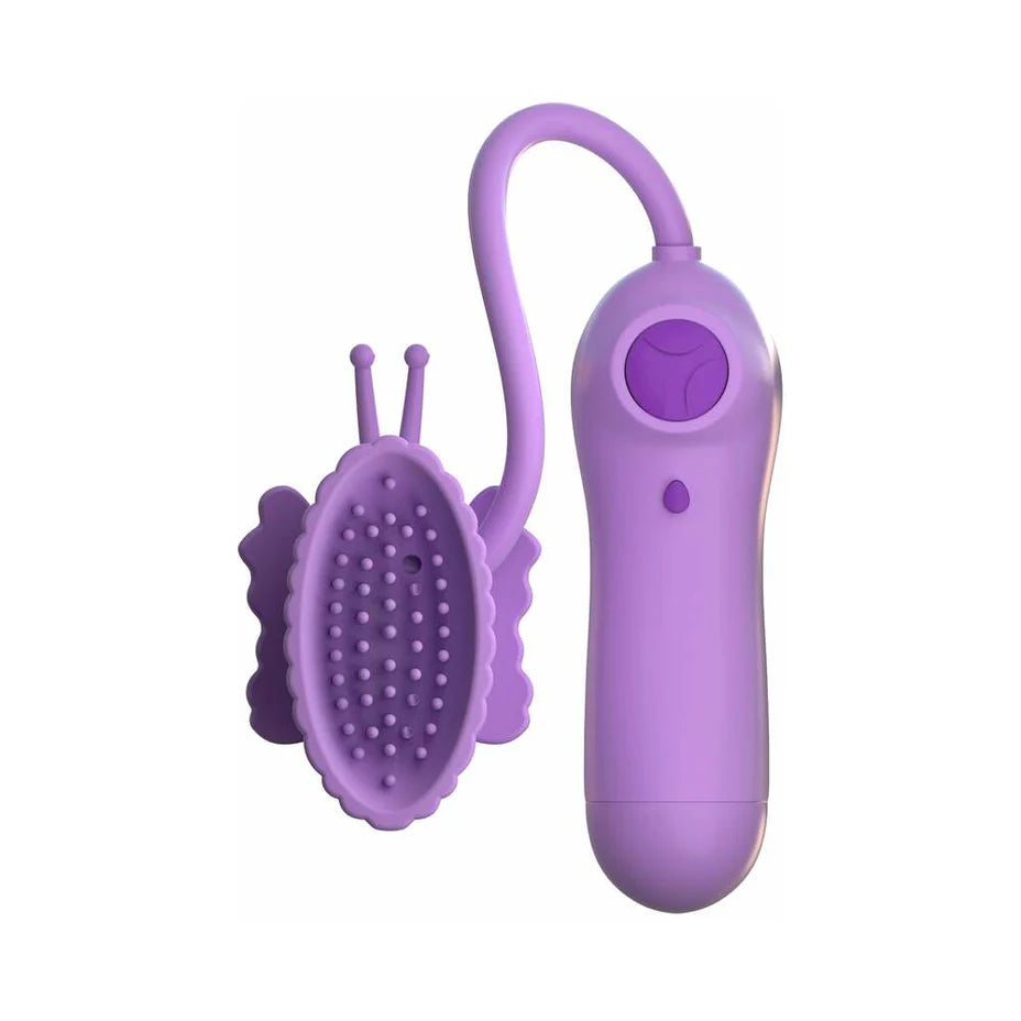 Remote controlled butterfly stimulator with suction action that simulates oral sex. Vibrates and pumps as well. Requires 2 AA batteries, not included. Measures 25.5 in. long.