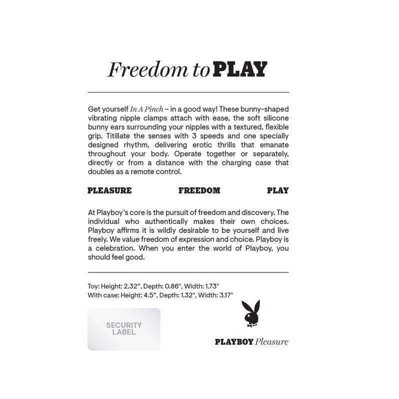 Get yourself In A Pinch – in a good way! These bunny-shaped vibrating nipple clamps attach with ease, the soft silicone bunny ears surrounding your nipples with a textured, flexible grip. Titillate the senses with 3 speeds and one specially designed rhythm, delivering erotic thrills that emanate throughout your body. Operate together or separately, directly or from a distance with the charging case that doubles as a remote control.