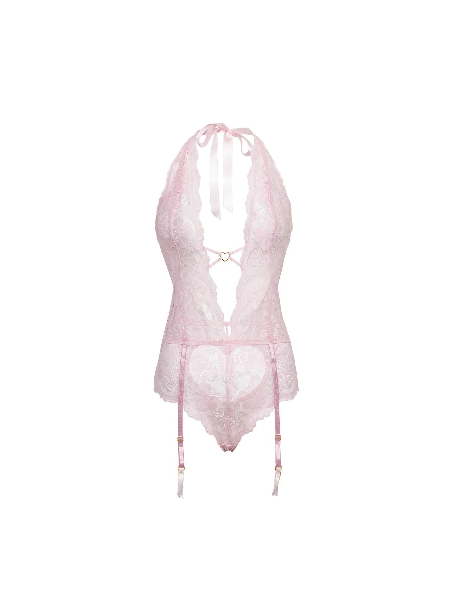 Embrace your inner vixen this Valentine's Day with Reign, the lacy galloon teddy in flirty pink. Featuring a plunging neckline and heart-shaped ring accent, this outfit comes with an attached garter and a crotchless open heart back panty. For a perfect fit and added comfort, the neck is adorned with halter ribbon straps.