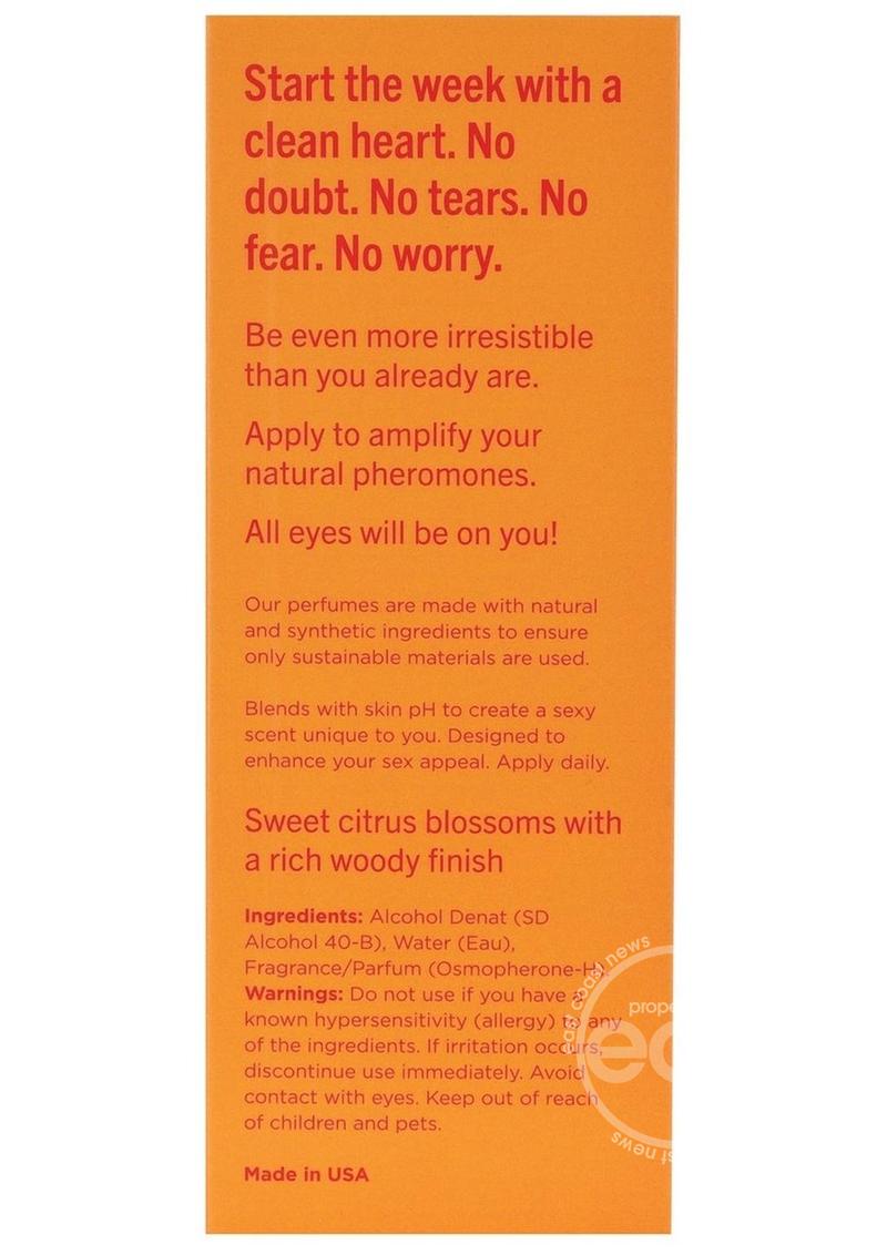 Sweet citrus blossoms with a rich woody finish. Top Notes: Citrus accord, orange blossom, luscious william pear. Mid Notes: Pearl tuberose accord, white gardenia, sambac jasmine. Bottom Notes: Crystal amber, blonde cedarwood, warmed benzoin. Start the week with a clean heart. No doubt. No tears. No fear. No worry. Be even more irresistible than you already are. Apply to amplify your natural pheromones. All eyes will be in you! Hold fragrance 5-7 inches away from skin and apply to pulse points. Blends with skin pH to create a sexy scent unique to you. Designed to enhance your sex appeal.