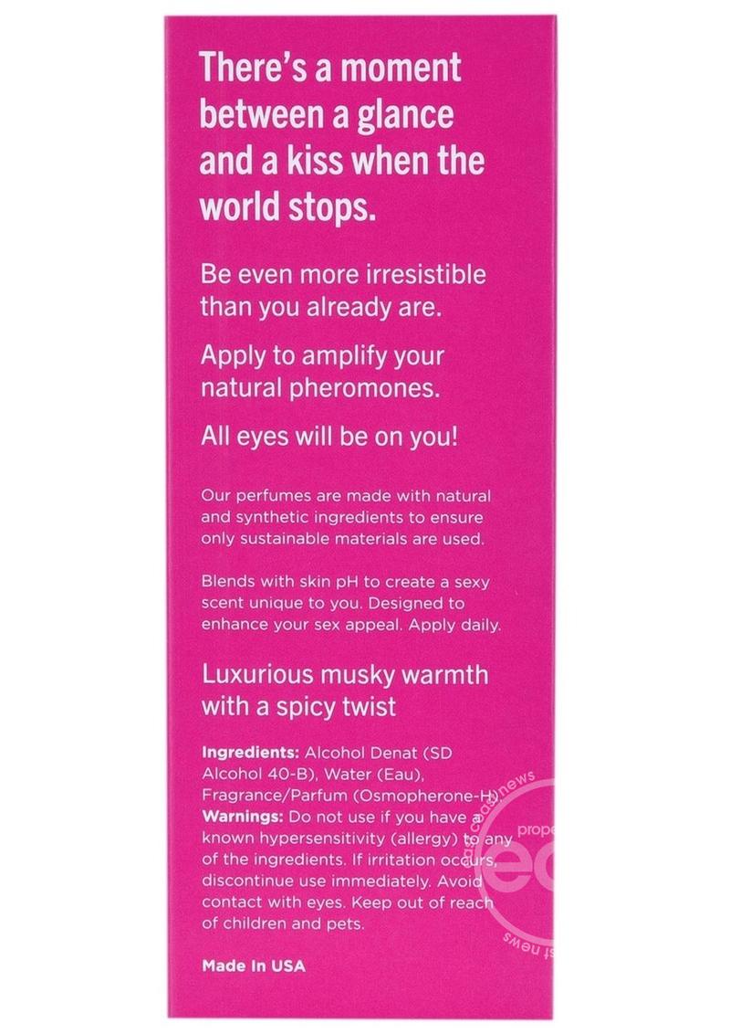 Luxurious musky warmth with a spicy twist. Top Notes: Natural bergamot, lemon, cardamon, mimosa and violet. Mid Notes: Tuberose, violet, muguet and magnolia. Bottom Notes: Musk and tonka. There's a moment between a glance and a kiss when the world stops. Be even more irresistible than you already are. Apply to amplify your natural pheromones. All eyes will be on you! Hold fragrance 5-7 inches away from skin and apply to pulse points. Blends with skin pH to create a sexy scent unique to you. Designed to enhance your sex appeal.
