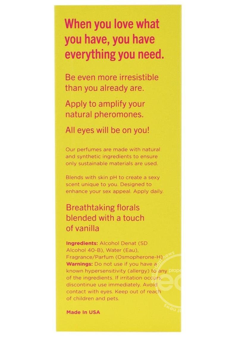 Breathtaking florals blended with a touch of vanilla. Top Notes: Fresh tropical mandarin and tangerine. Mid Notes: Spring rose, jasmin, gardenia, sweet apple and juicy pineapple. Bottom Notes: Patchouli, warm vanilla, sweet musk, tonka and creamy sandalwood. When you love what you have, you have everything you need. Be even more irresistible than you already are. Apply to amplify your natural pheromones. All eyes will be in you! Hold fragrance 5-7 inches away from skin and apply to pulse points. Blends with skin pH to create a sexy scent unique to you. Designed to enhance your sex appeal.