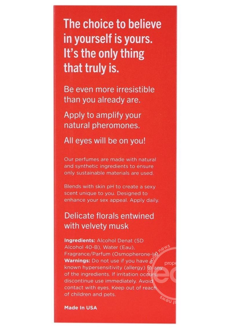 Delicate florals entwined with velvety musk. Top Notes: Natural fresh lemon, sweet bergamot and mandarin. Mid Notes: Natural violet, rose, muguet, pink peppercorn, cardamon, juicy raspberry, pear, crisp apple and pineapple sorbet. Bottom Notes: Sweet amber, sandalwood, musk and natural sandalwood. The choice to believe in yourself is yours. It's the only thing that truly is. Be even more irresistible than you already are. Apply to amplify your natural pheromones. All eyes will be on you! Hold fragrance 5-7 inches away from skin and apply to pulse points. Blends with skin pH to create a sexy scent unique to you. Designed to enhance your sex appeal.