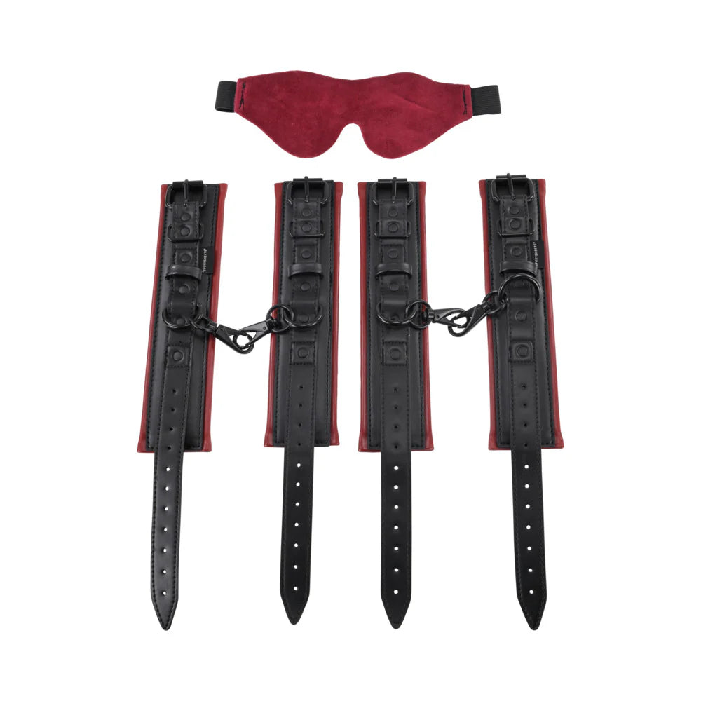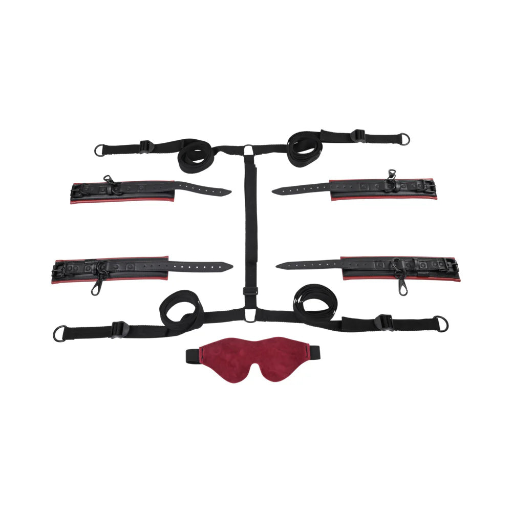 The original (yes, we invented it) Under the Bed Restraint System just got a sultry and seductive new look! Set up in minutes, the alluring deep reds create a lust filled setting made for the naughtiest play. 4 luxurious adjustable cuffs in soft and supple faux leather with restraint straps secure to one center connector strap fitting securely under your mattress. Restrain your partnersft. arms and legs from the sides or bottom of the bed for an intoxicating experience as you explore their body. The restraint strap quickly fits beneath any mattress with no hooks and adjusts to the size you desire to firmly hold you back on any sized mattress. Use it at home as a removeable or permanent addition to your bedroom or take it on the go for a seductive addition to your romantic getaways as you surrender to ecstasy.