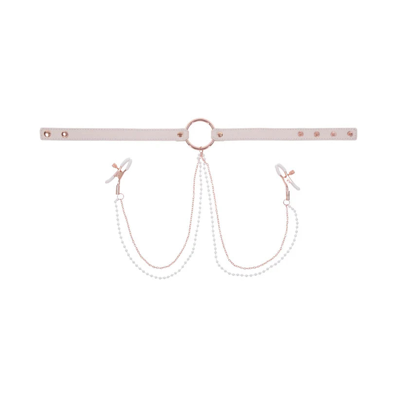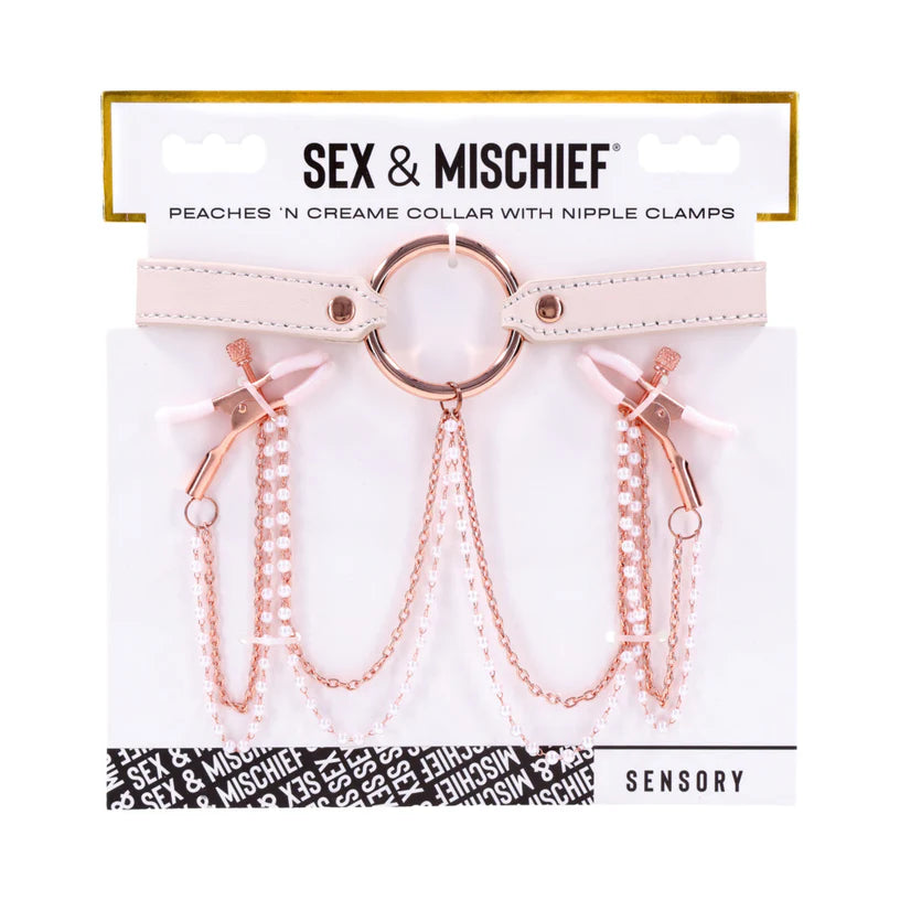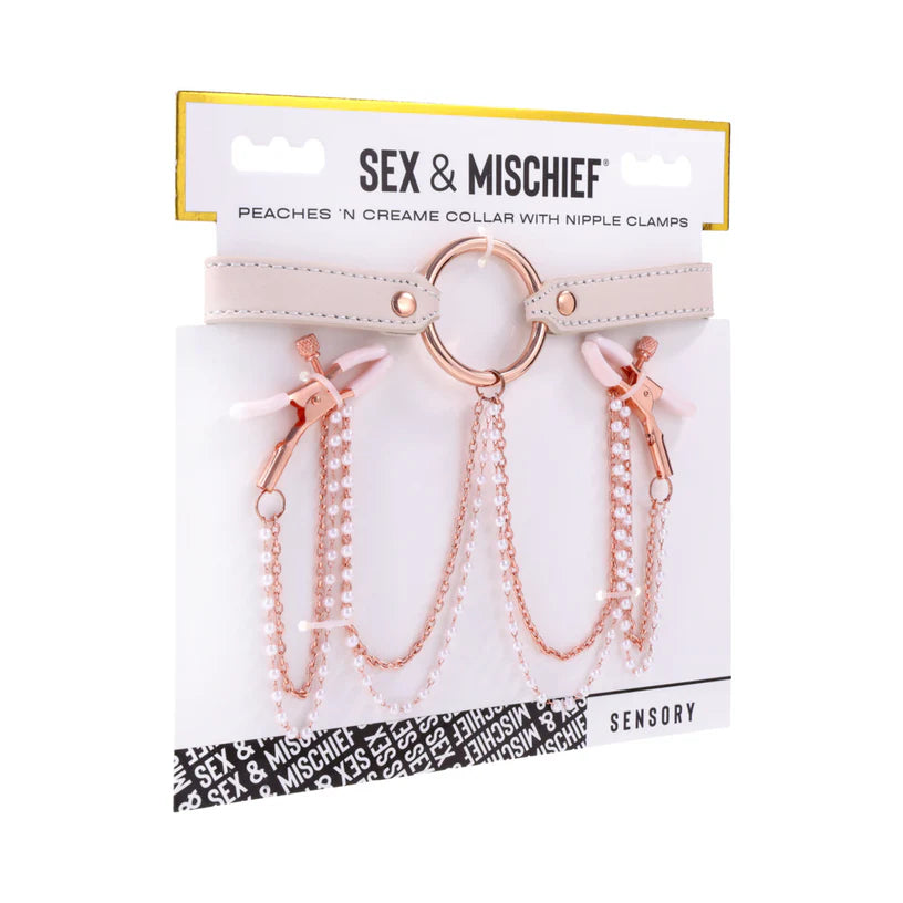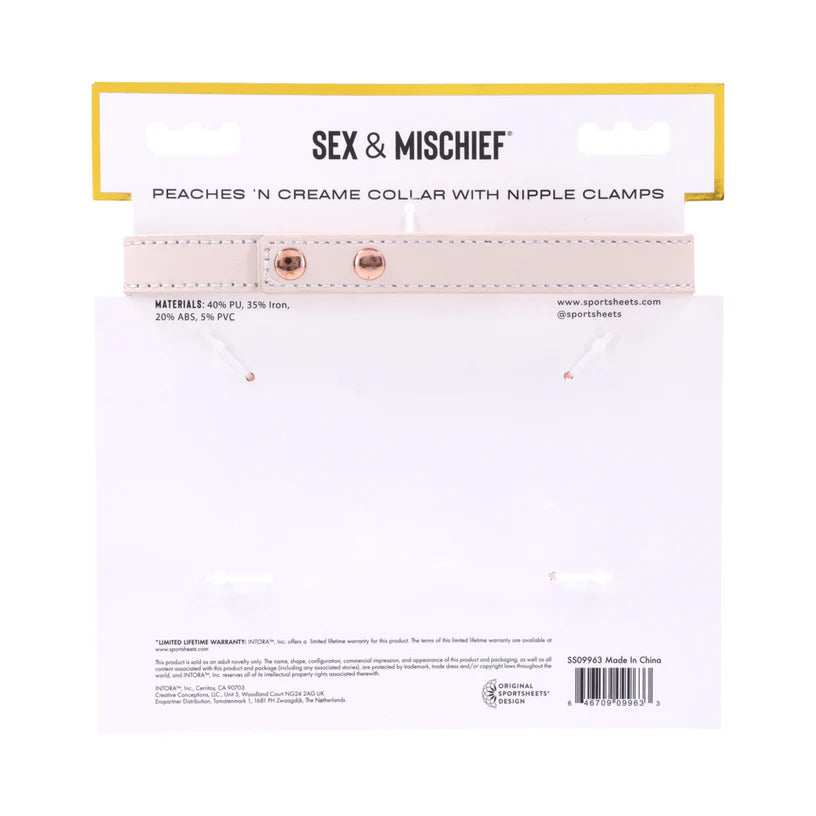 Spice up your playtime with the Peaches 'n CreaMe Collar with Nipple Clamps and experience extraordinary pleasure! This playful accessory blends luxury with a touch of naughtiness, featuring a delightful peach-colored collar adorned with rose gold hardware and tantalizing attached nipple clamps! The soft faux fur lining ensures comfort, while the adjustable collar guarantees a snug fit for all peach enthusiasts. Secure the rose gold clasp, let the nipple clamps do their flirty magic, and get ready to turn up the heat in your intimate moments. Whether you're a curious beginner or a seasoned adventurer, this playful accessory adds a dash of charm and a hint of sweetness to your escapades.