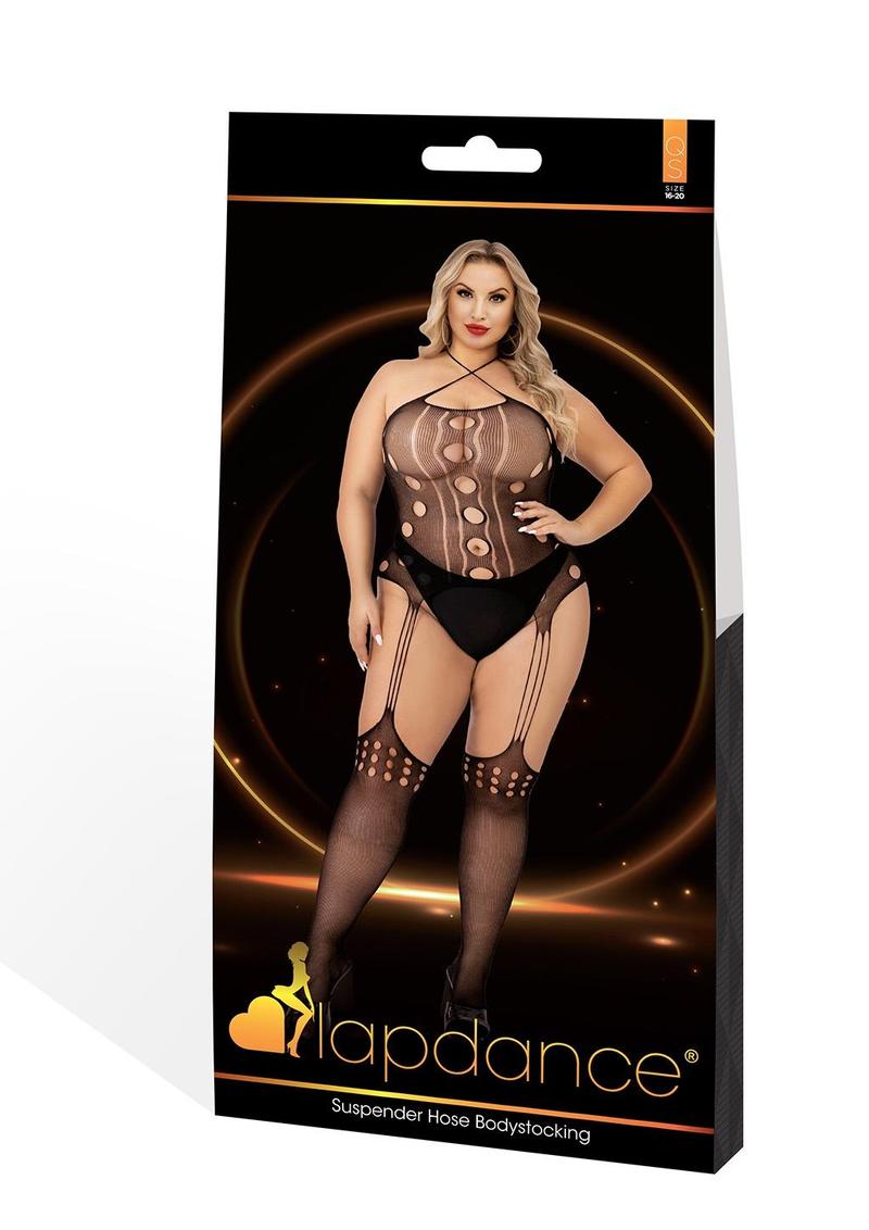 The Lapdance Lingerie Suspender Hose Bodystocking is a provocative one-piece crafted from a sleek blend of nylon and spandex, ensuring a comfortable yet form-fitting silhouette. This black bodystocking features alluring holes along the front, back, and legs, creating an enticing peek-a-boo effect that adds to its bold appeal. Thin, delicate straps connect the hosiery to the sheer, see-through top, blending elegance with risqué charm. Perfect for making a lasting impression, this piece is designed to embrace and enhance every curve.