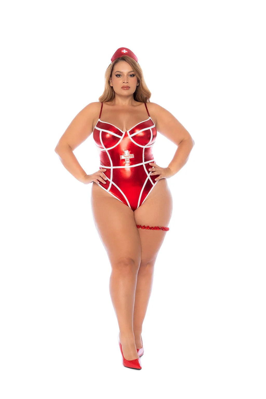 Nursing has never looked this sexy. This nurse costume features bodysuit with adjustable straps in a trendy metallic red finish, comes with a matching garter and headpiece for a bold, playful look.