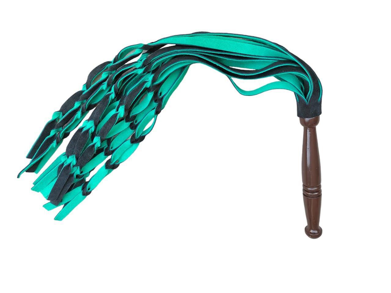 TWO-TONED BRAIDED LEATHER FLOGGER WITH WOOD HANDLE