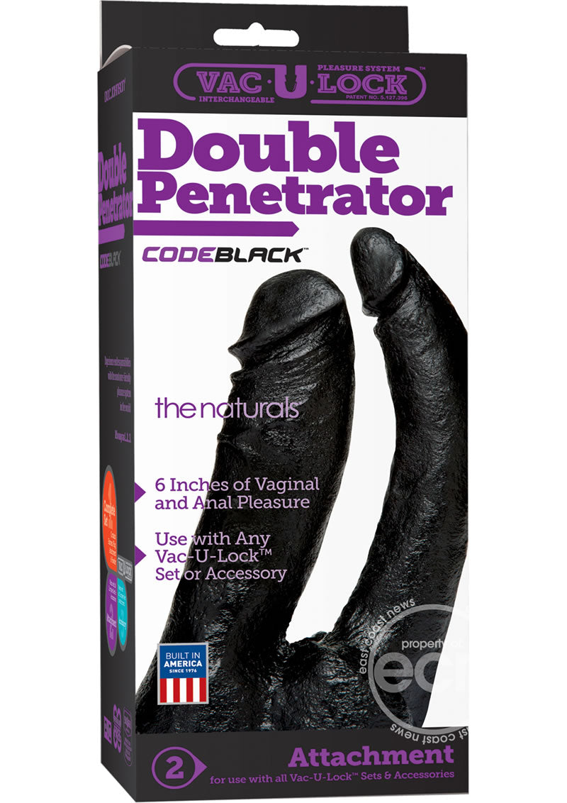 Double your pleasure with the Double Penetrator! Experience the amazing sensations of simultaneous vaginal and anal stimulation with this Vac-U-Lock Attachment featuring two 6 inch long phallic dongs. Use with any Vac-U-Lock set or accessory. Phthalate-Free, Body-Safe Material. Proudly Made in America.