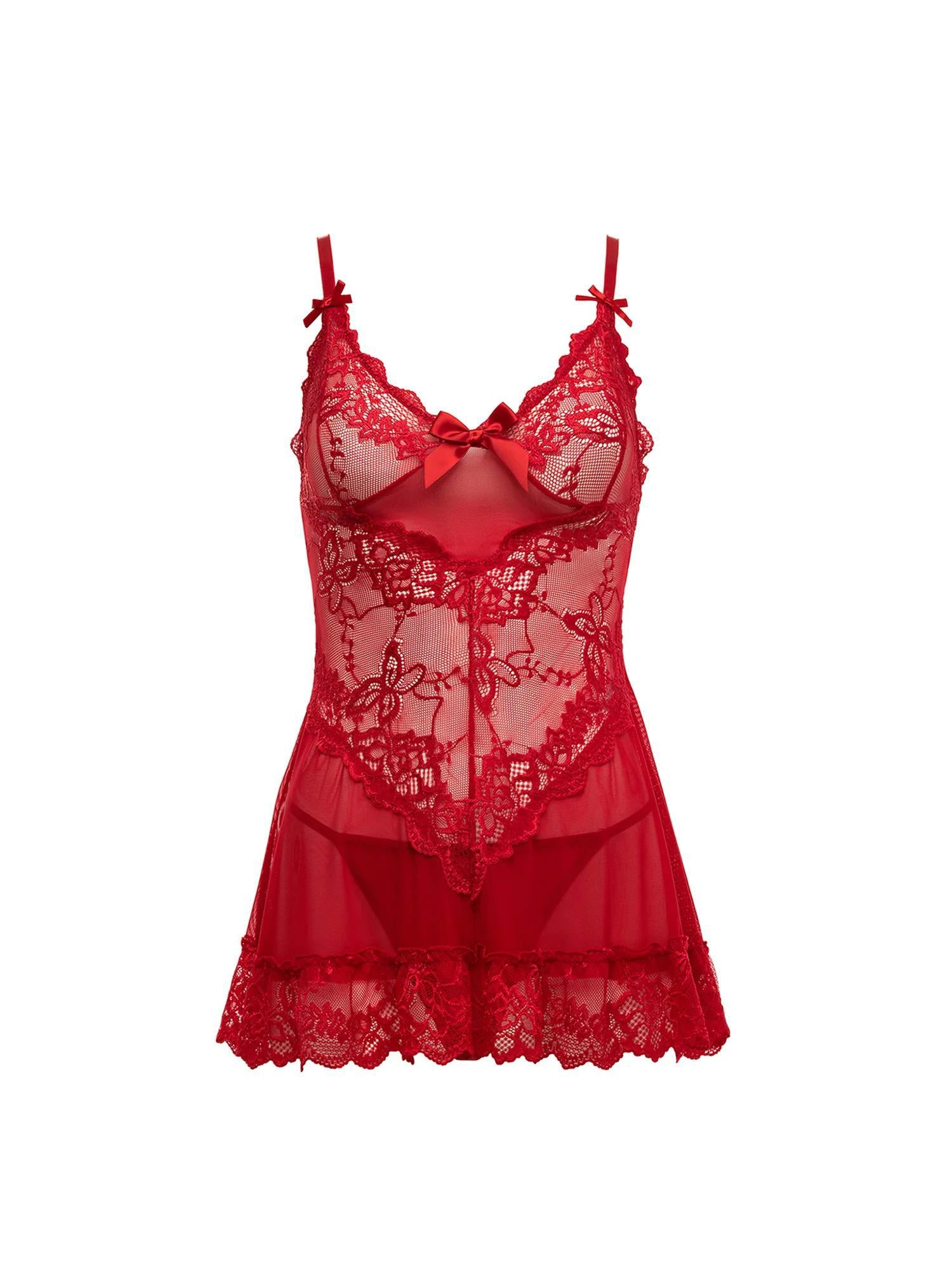 Turn up the romance any season with the Valentine Lacey Babydoll. This stunning A-line lacy babydoll features a seductive triangle cup bodice made from ultra-soft fabrics, ensuring all-night comfort on Valentine’s Day or any day. Adjustable elastic shoulder straps allow for a personalized fit, while the sheer mesh body with lace inserts and flirty ruffled hem adds an elegant touch. The charming bow detail at the center-front, paired with a matching G-string makes this set irresistible. Available in multiple fun colors in standard and plus sizes, this Valentine lace babydoll is the perfect choice for a special night in.
