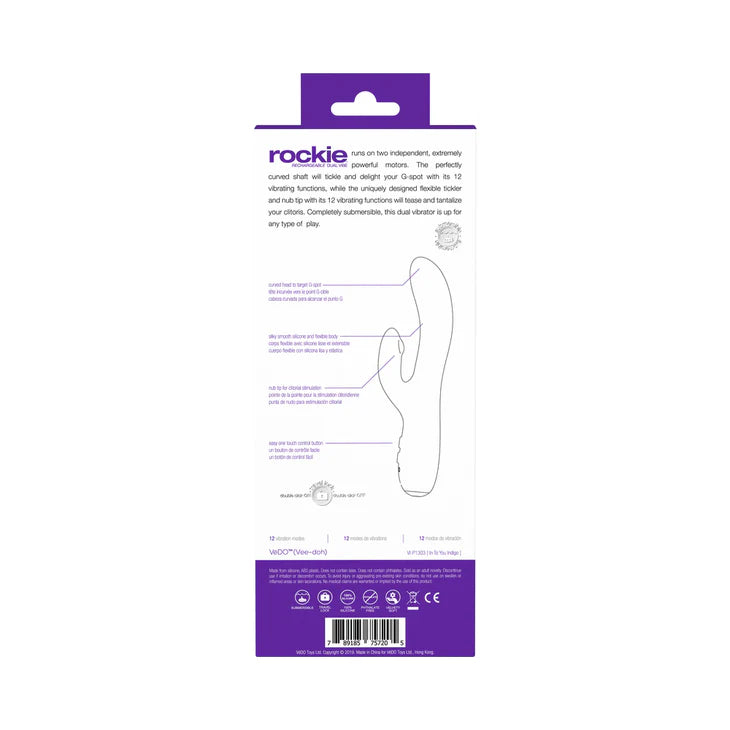ROCKIE rechargeable dual vibe runs on two independent, extremely powerful motors. The perfectly curved shaft will tickle and delight your G-spot with its 12 vibrating functions, while the uniquely designed flexible tickler and nub tip with its 12 vibrating functions will tease and tantalize your clitoris. Completely submersible, this dual vibrator is up for any type of play.