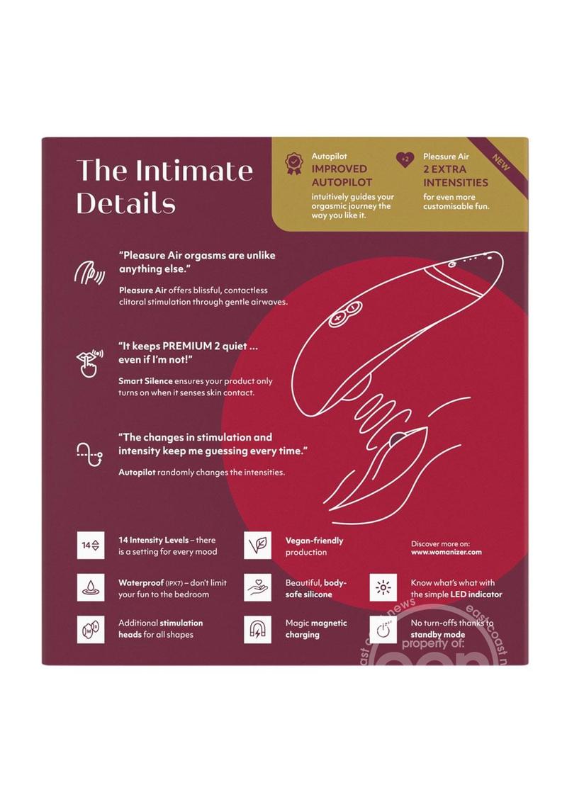 PREMIUM 2 is Womanizer's most luxurious toy yet, now with 14 intensity levels, discreet and innovative Smart Silence and an improved Autopilot feature for an indulgent, guided experience.