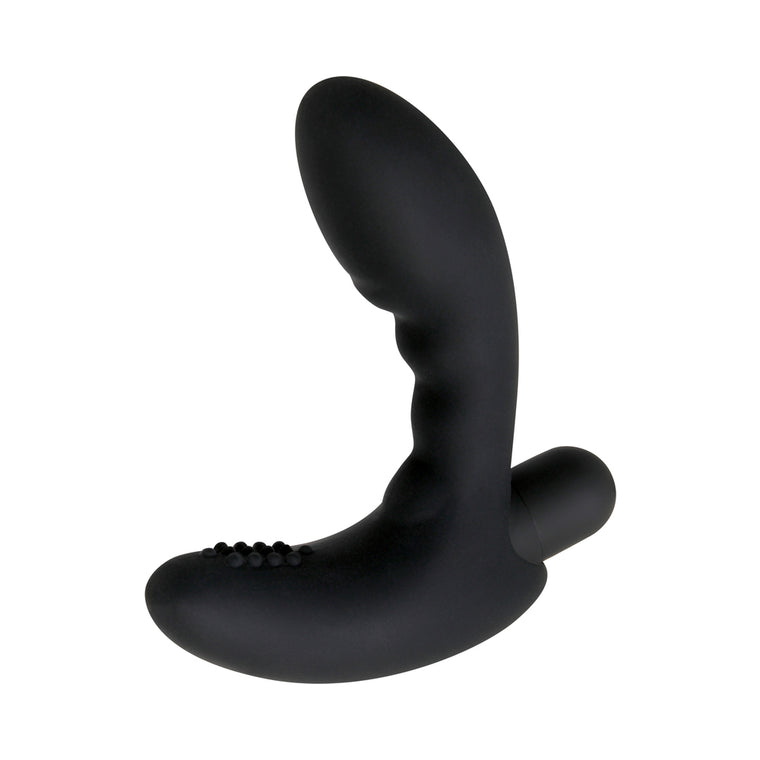 This smooth silicone vibrating prostate toy is ergonomically shaped to reach the P-spot easily. Includes powerful bullet with 10 separate functions. Submersible. Easy grip handle doubles as a safety base. Rechargeable, with cord included. Measures 4.75 in. high by 1.25 in. wide.